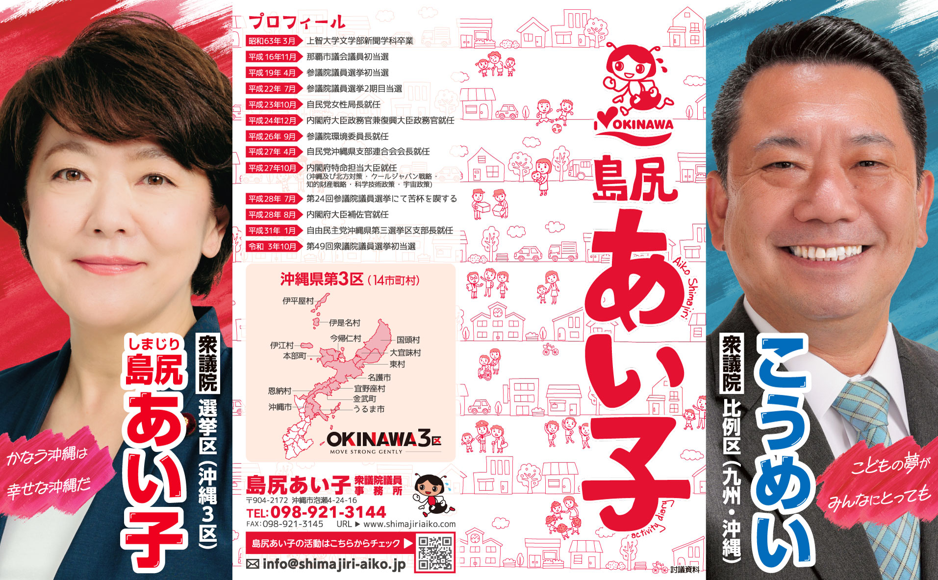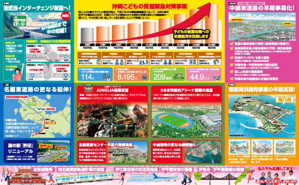 衆議院選挙初当選から、皆さまの負託に応えるべく、全力で沖縄振興に取り組んできました。 私が政治を目指した原点は「子どもを取り巻く環境を良くしたい」沖縄担当大臣の時「沖縄子ども貧困対策事業」を創設、あれから9年、予算は10億から22億に倍増しました。 その予算で「子どもの居場所」を作り「支援員を配置」。そして「若年妊産婦の居場所」も設置しました。 今後は、新たな取り組みとして、子ども達の将来的な自立に向けた「学習支援」や「就労支援」など、総合的な仕組み作りにチャレンジします。障がいのある人もない人も、そして全ての女性、全ての高齢者が生涯にわたって安心して過ごせる沖縄を作って参ります。 これからは、沖縄市、うるま市、名護市と11町村の北部、つまり沖縄第三選挙区こそが沖縄の成長のカギ。沖縄初の北部テーマパークJUNGLIA(ジャングリア)も全力で支援していきます。 那覇市を含む沖縄県南部と中北部の格差是正は喫緊の課題。インフラ整備、経済対策、医療、福祉、そして公平な教育の機会向上に全力で取り組んでまいります。